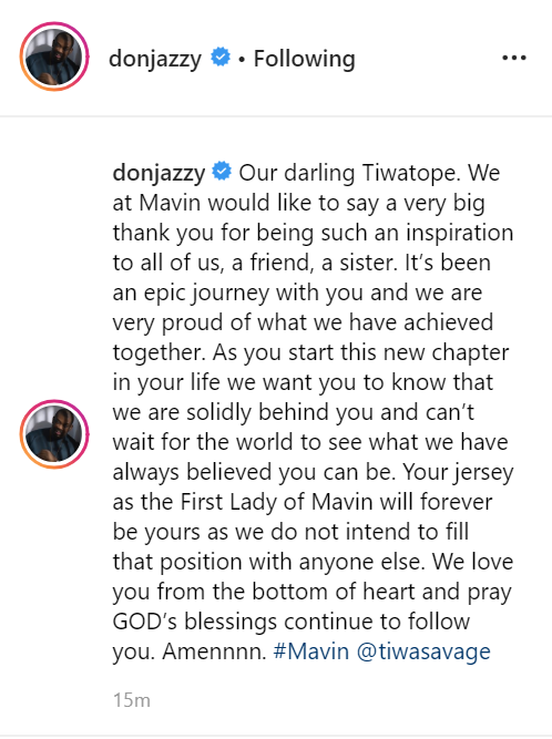 Producer and recording artist, Donjazzy who founded the company on May 8, 2012, took to his Instagram page to make the announcement and thank Tiwa for being an inspiration.