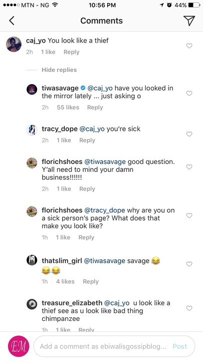 Usually she let it pass, But Sometime you gotta straighten a non-fan, Tiwa Savage just gave an epic reply to a fan who said she looks like a Thief, after she shared the photo above, in her less busy time she advised the non-fan to get a glimpse of the mirror, lol..