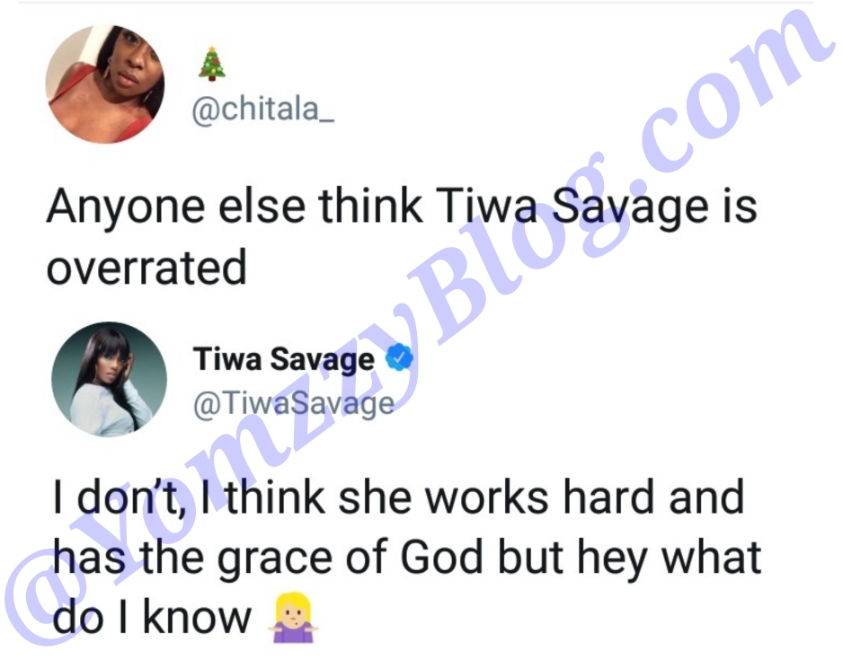Nigerian musician and Mavin Records First lady, Tiwa Savage replied a lady on social media who thinks she is overrated.