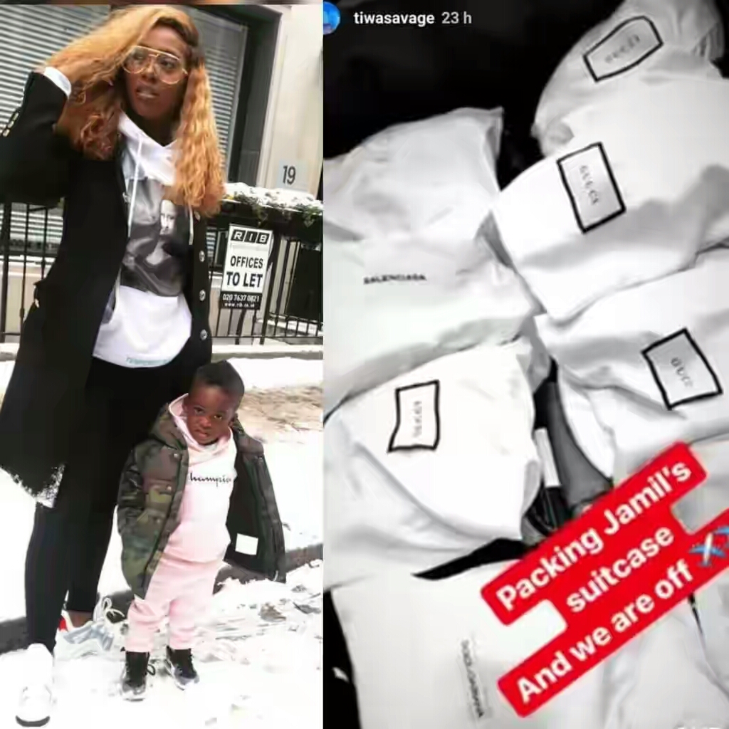 Nigerian singer,Tiwa Savage shared a photo of her son,Jamil’s suitcase filled with Gucci as they prepare to jet out .