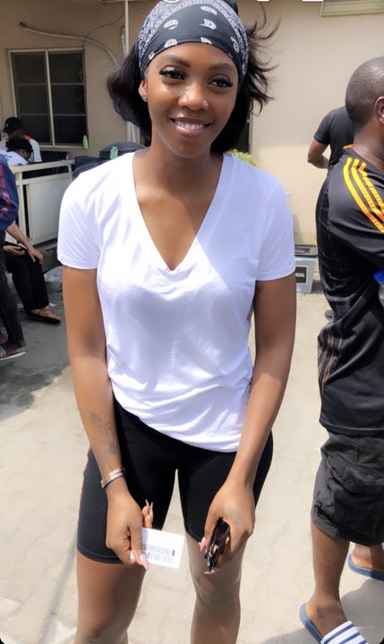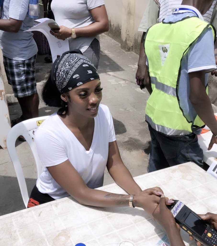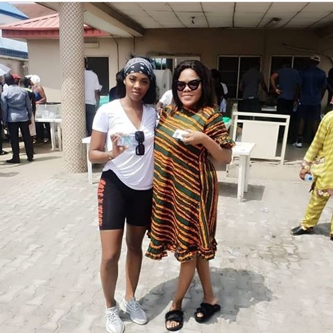 Nigerians celebrities, Tiwa Savage and Toyin Abraham show off their PVC at their polling unit in Lagos.