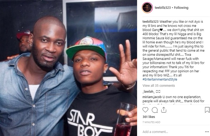 ‘Weather you like or not Ayo is my lil bro and he knows not cross me blood Gang….. we don’t play that poo on 400 blocks! That’s my lil Nigga and is Big Hommie Sauce kid guaranteed me on the lil homie even though he’s my blood and I will ride for him………. I’m just saying this to the general public that tend to come at me on some disrespectful poo….. Tiwa Savage/MamaJamil will never Bleep with your billionaires not to talk of my lil bro for your information! Thank you Titi for respecting me! FFF your opinion on her and my lil bro WiZ….. it’s all #EntertainmentandStyle.”