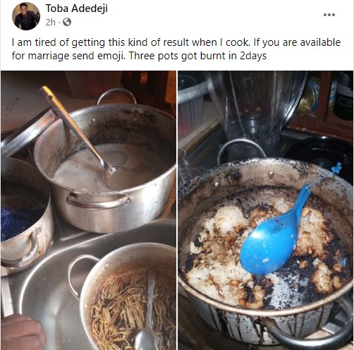 He took to Facebook As Obtained By NaijaCover, to reveal that he burnt 3 pots of food in 2 days and he shared photos of the burnt pots.