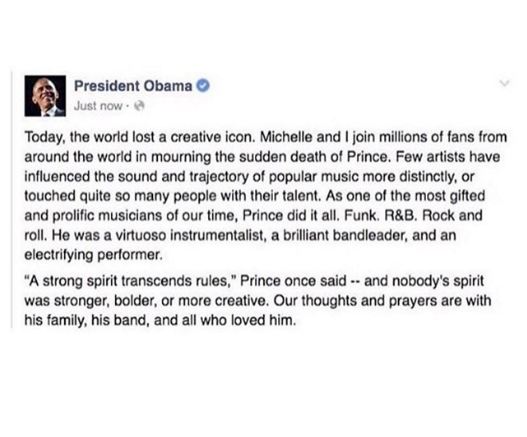 President of the United State of America Barrack Obama has joined millions of fan worldwide to mourn the death of music icon Prince