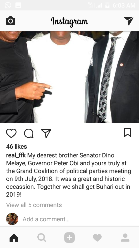 Femi Fani Kayode was pictured recently with gov Peter obi and Kogi senator Dino Malaye at the party coalition meeting.