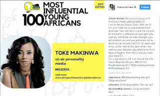 “Yesssssssssssssssssss!!!! And it just keeps getting better . . I am an African Brand, God’s little star {3 this just made me so overwhelmed with gratitude. You said you’ll make me a praise on the earth, a reflection of your light, you said you will clothe me with strength, you will establish me and you promised not to leave me nor forsake me. . it’s all about you Jesus, at the start of this year while I was seeking your direction you told me to think beyond Nigeria, think Africa! . . I’m a city set on a hill, thank you Africa, think International and you’ve kept your word. I am one of the 100 most influential Africans, #MlYAl 00 #styleinfluencer2017 #TMissababygirlforlife #TMtotheworld”