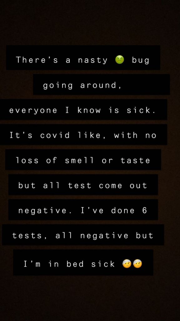 “There is a nasty bug going around. Everyone I know is sick. It’s covid like, with no loss of smell or taste but all tests come out negative. I’ve done 6 tests, all negative but I’m in bed sick.