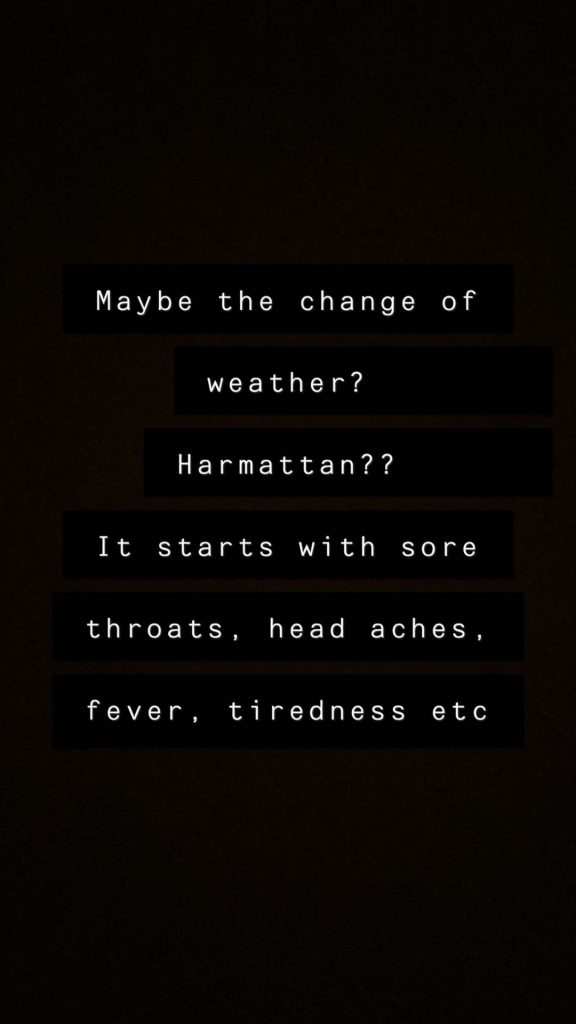 “Maybe the change of weather? Harmattan? It starts with sore throats, headaches, fever, tiredness etc,” she wrote.