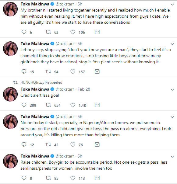 ”Reading up on the Anthony Joshua statement saddens me but it’s not an AJ problem guys, we are the products of our society and we are all guilty. Spiritually it’s a woman’s job too. Ahn ahn… I once heard a grown ass man say his mum prays or is a prayer warrior and he expects his wife to continue to cover him in prayers, why can’t he carry the burden spiritually too? #Amnotunderstanding. We say “let’s boys be boys” but we can’t handle the reality of who they become! This must stop, we all have a part to play. Too many seminars, groups, panels for women and who raises the men? From time this has been happening and the earliest we realize it does no one any good the better. The next time you want to permit your son, nephew etc to not take part in home chores in the name of “he is a man”, look around you and have a rethink. Raise children. Boy/girl to be accountable period. Not one sex gets a pass, less seminars/panels for women, involve the men too. No be today it start, especially in Nigerian/African homes, we put so much pressure on the girl child and give our boys the pass on almost everything. Look around you, it’s killing them more than helping them. Let boys cry, stop saying “don’t you know you are a man”, they start to feel it’s a shameful thing to show emotions, stop teasing little boys about how many girlfriends they have in school, stop it. You plant seeds without knowing it. My brother n I started living together recently and I realized how much I enable him without even realizing it. Yet I have high expectations from guys I date. We are all guilty, it’s time we start to have these conversations. As a female you condone your brothers keeping many girlfriends yet you want to cry wolf when another man does it to you, we let it slide when it is family, we need to do better”.