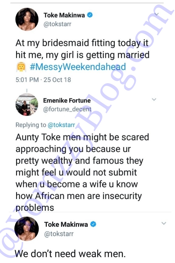 Media Personality Toke Makinwa took to her twitter handle to reveal she was at her bridesmaid fitting today and it hit her that friend is getting married, a concerned fan took to her comment section saying men would be scared of approaching her because of she is rich and famous that men might be scared that a wealthy and famous lady won’t be submissive to them but Toke Makinwa debunked the claims of intimidating her prospective husbands saying that a man shouldn’t be afraid of a strong woman because such is what men need to help push them out of their comfort zone and make them want to be more.