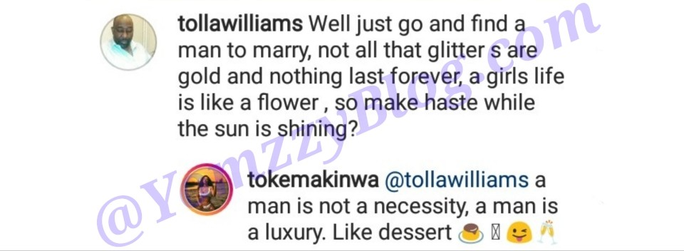 ‘A man is not a necessity’, Celebrity author and Media personality, Toke Makinwa replies fan who told her to find a man to marry before it gets too late.