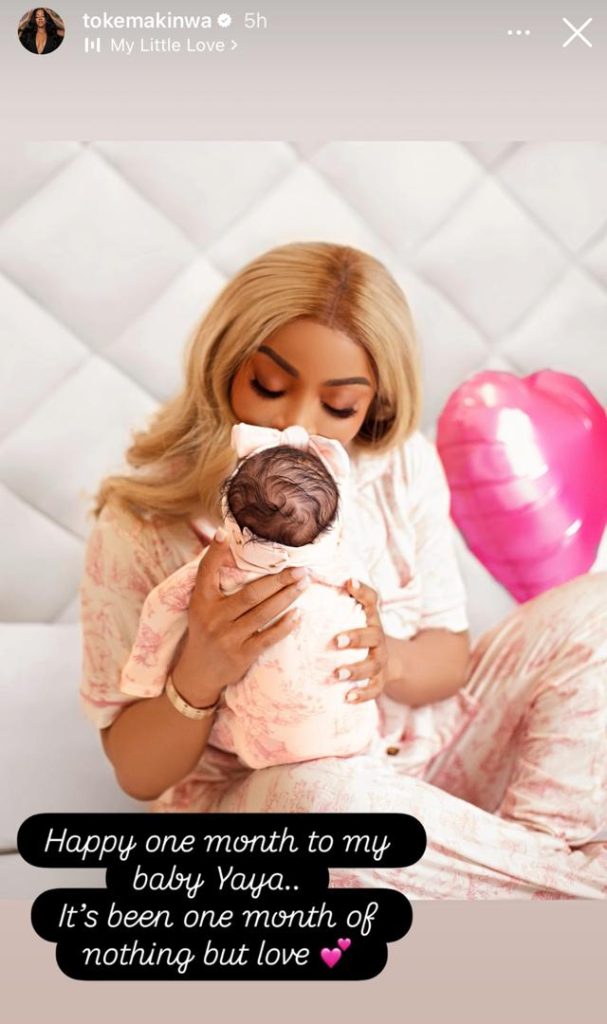 Toke Makinwa is celebrating her baby girl, Yakira, who turns one month old today, September 13.