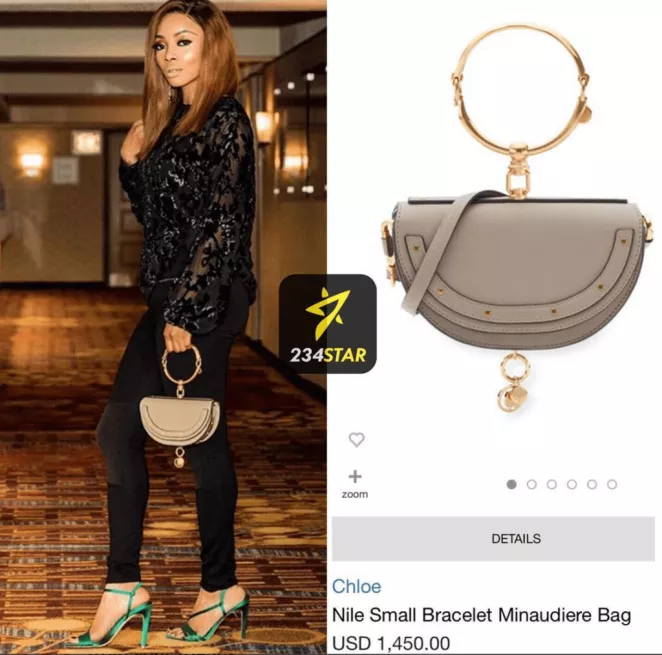 The media personality and author stepped out for dinner last night wearing an all black outfit, green heels and a 522,000 Naira Chloe Nile Small Bracelet Miaudiere Bag.