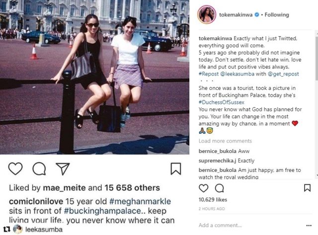 Sharing a photo of Meghan at 15 in front of Buckingham Palace, Toke advised women never to settle because they never know what God has planned for them and their lives could change in the most amazing way.
