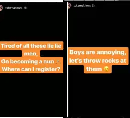 She took to her Instagram story to say that she is tired of men that lie and even asked for how she can become a nun.