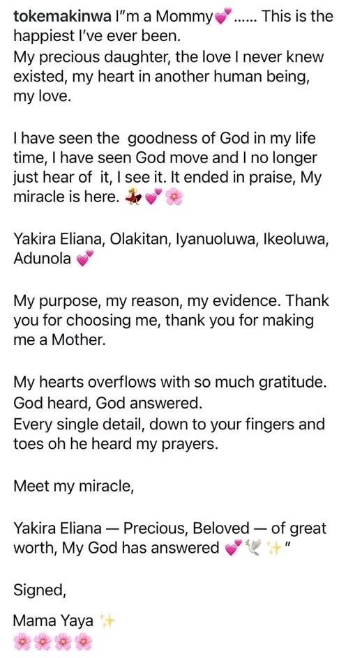 Asserting that she’s experienced God’s goodness, Toke Makinwa described her daughter as her purpose, evidence, and reason, expressing excitement over her arrival.