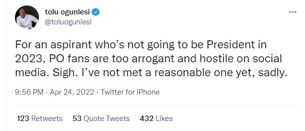 For an aspirant who’s not going to be President in 2023, PO fans are too arrogant and hostile on social media. Sigh. I’ve not met a reasonable one yet, sadly.
