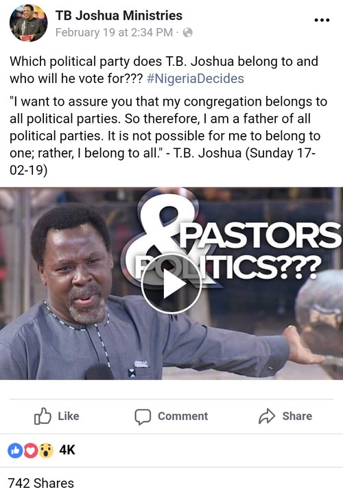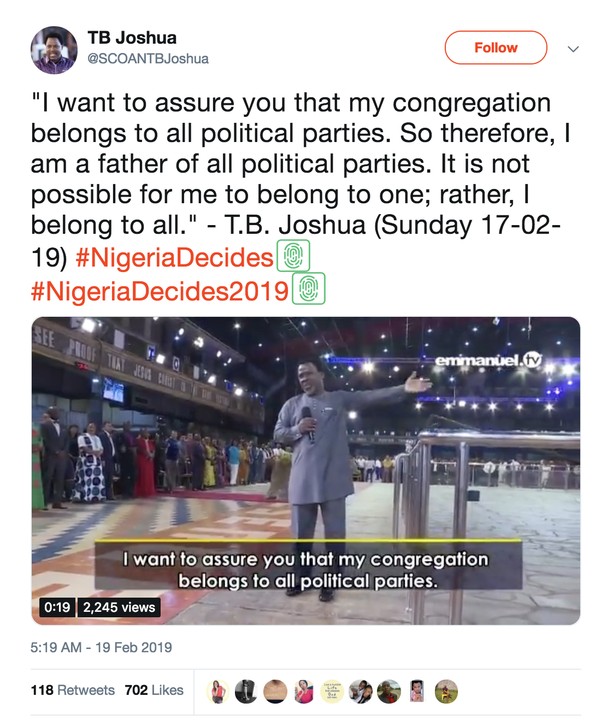 “I want to assure you that my congregation belongs to all political parties. So therefore, I am a father of all political parties. It is not possible for me to belong to one; rather, I belong to all.” – T.B. Joshua (Sunday 17-02-19)
