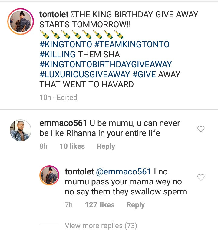 The follower referred to Tonto as a “mumu” and told her she can never be like Rihanna in her entire life.