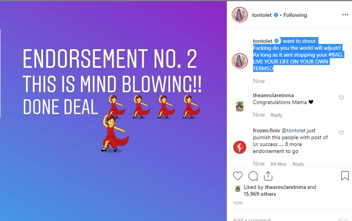 However keeping her fans updated with big happenings in her life and career, Tonto Dikeh announced she has bagged two endorsement deals. She further disclosed that doesn’t mind doing whatever she does, as long as it is not stopping her from securing the bag. She wrote;