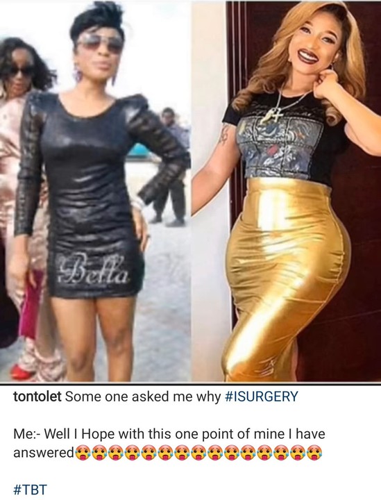 Tonto Dikeh has compared an old photo of her body to a more recent one after undergoing cosmetic surgery.