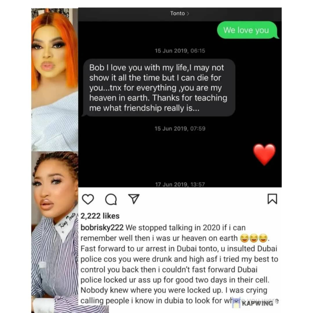 Actress Tonto Dikeh has accused crossdresser, Bobrisky of lying about her arrest in Dubai. Bob had claimed that her former bestie was arrested in Dubai and charged to court for being in possession of weed. He said he was the only one who stood by her at the time. However, In a post she shared on her Instagram page, Tonto dismissed his claim saying she was arrested for illegal filming and insulting a security officer. Read what she wrote below: