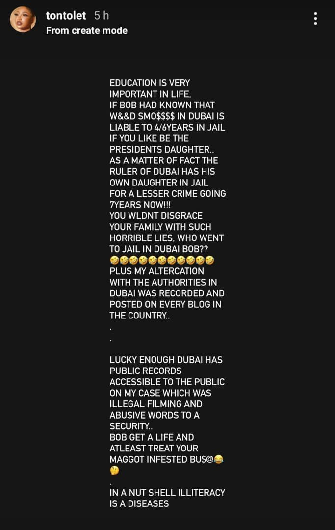 Tonto Dikeh Counters Bobrisky’s Claim That She Was Arrested In Dubai For Being In Possession of Weed