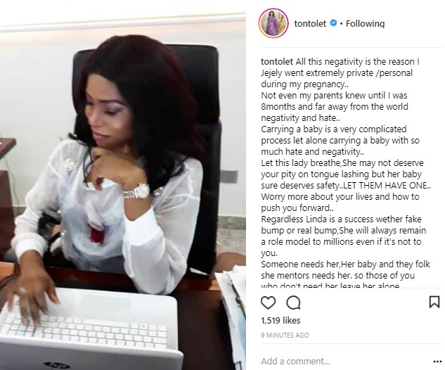 Controversial Nollywood actress, Tonto Dikeh has taken to Instagram to show support to Linda Ikeji as she is still being dragged on social media since the announcement of her pregnancy.