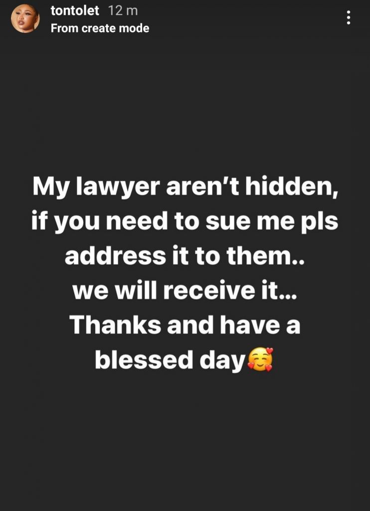 “My lawyer aren’t hidden, if you need to sue me pls address it to them.. we will receive it… Thanks and have a blessed day.”