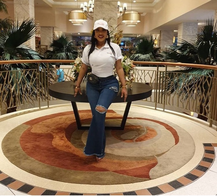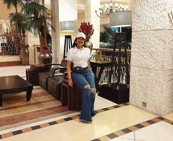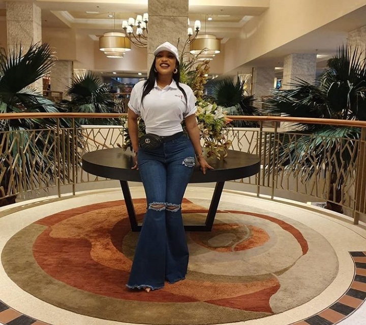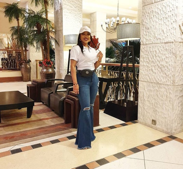 Actress Tonto Dikeh, the mother of one rocks in styles as she stuns in crazy buttcot trouser with white t-shirt. She paired with white face cap with a pair of white sneakers.