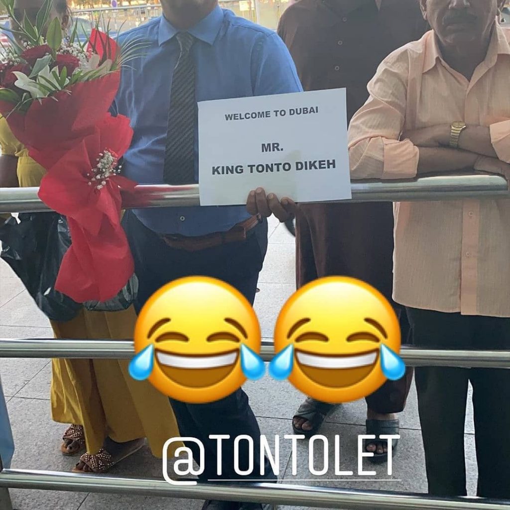 Airport pickup driver welcomed her to Dubai with a placard written on it a funny caption ”welcome to Dubai Mr King Tonto Dikeh”.