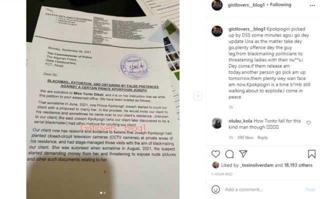 He was alleged to have been arrested over allegations of blackmail and extortion. This is according to information released by Instagram blogger, Gistlovers. The blog also shared photos of the petition filed against the Delta-born politician.