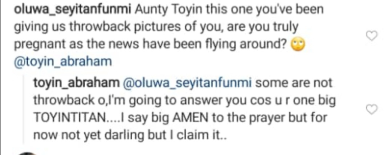 Nollywood actress, Toyin Abraham has denied reports that she is pregnant. She made this known while replying a fan who inquired if reports that she is pregnant is true.