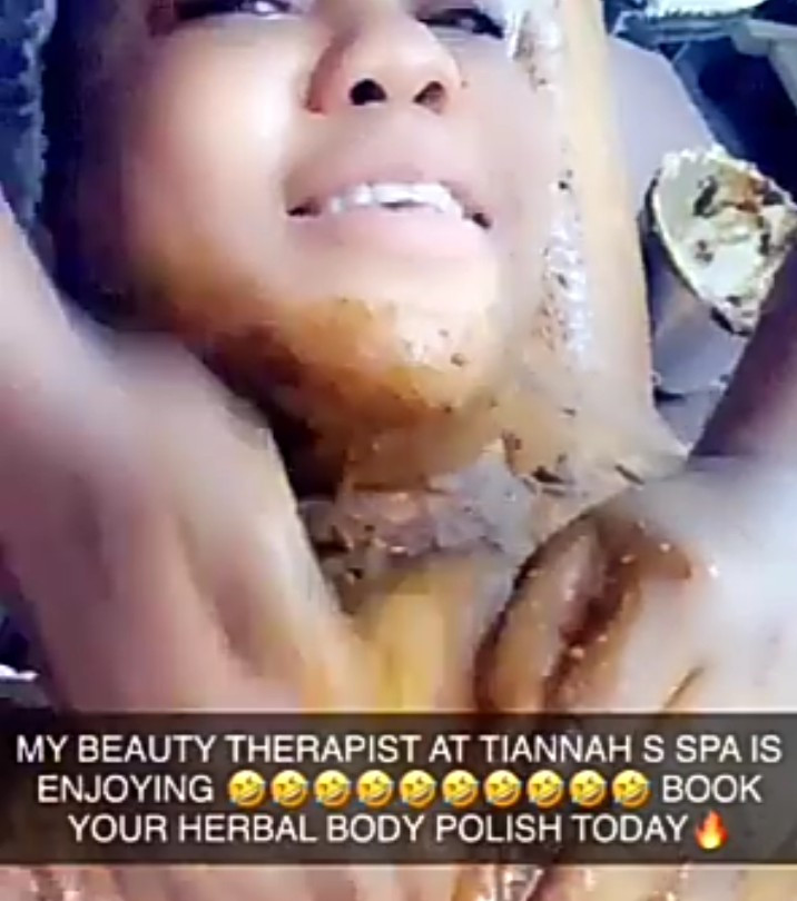 Toyin Lawani had a spa session with one of her staff massaging her naked breast and it was filmed and shared online.