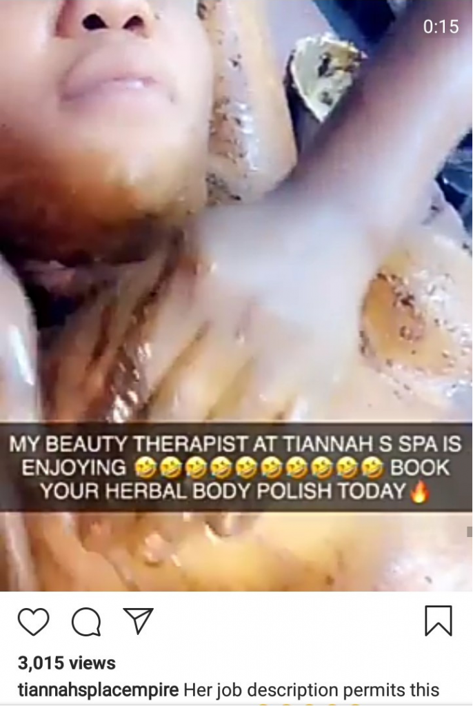 In the video, the masseuse is seen applying a body scrub on Toyin’s breasts and massaging to rub it in.