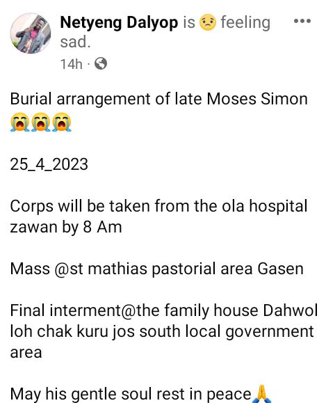 He will be laid to rest on Tuesday, April 25, 2023, at his family compound in Dahwol Loh Chak, Kuru in Jos South Local Government Area of Plateau State.