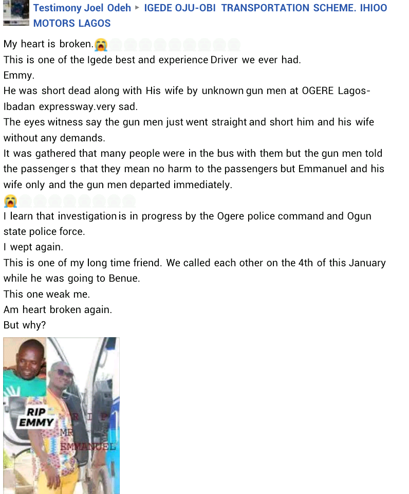 Gunmen shot a driver identified as Emmanuel Oga and his pregnant second wife along Lagos-Ibadan Expressway.