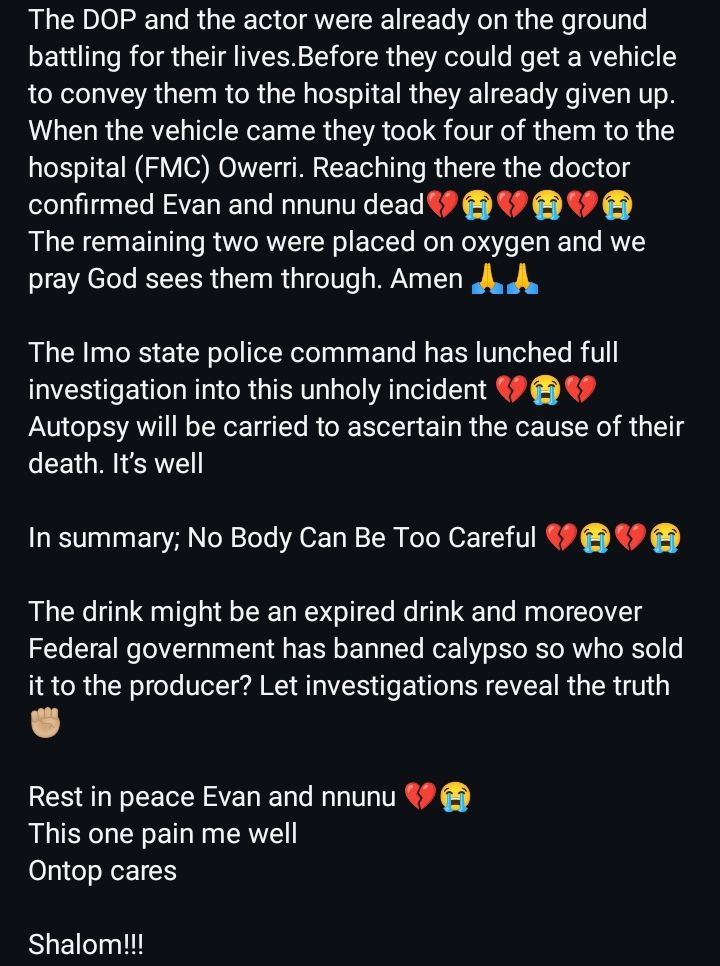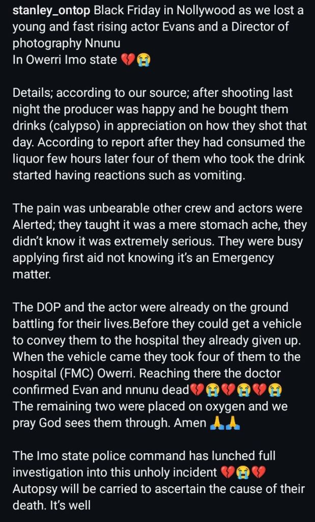 According to Stanley Ontop, the duo died after consuming drinks bought by a movie director as a token of appreciation for their work on set.