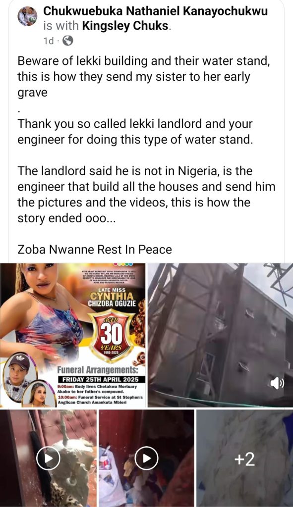 A young Nigerian lady, Cynthia Chizoba Oguzie, has tragically lost her life after a water tank collapsed into her room in the Lekki area of Lagos State.