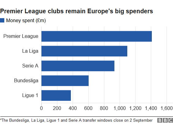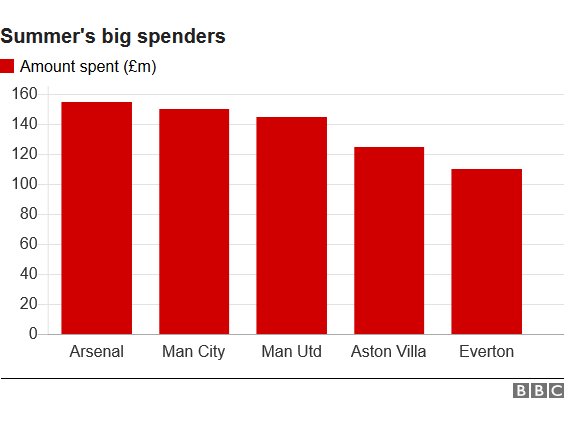 Arsenal were the biggest spenders in England during the window, splashing out £155m. On deadline day, they bought £25m Celtic left-back Kieran Tierney and £8m Chelsea centre-back David Luiz.