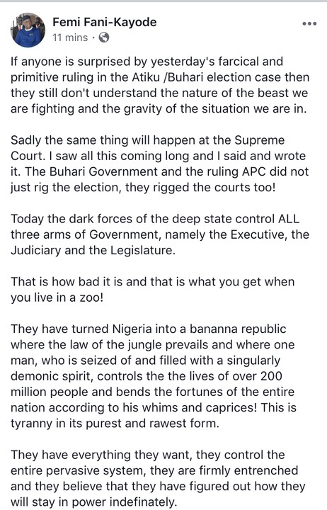 If anyone is surprised by yesterday’s farcical and primitive ruling in the Atiku /Buhari election case then they still don’t understand the nature of the beast we are fighting and the gravity of the situation we are in.