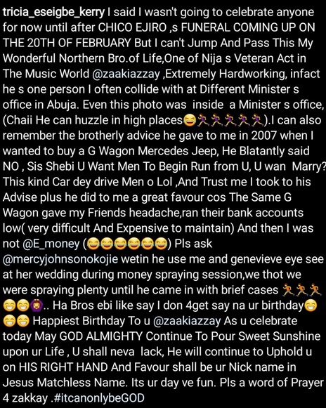 She wrote on Instagram: “I can also remember the brotherly advice he gave to me in 2007 when I wanted to buy a G Wagon Mercedes Jeep, He Blatantly said NO , Sis Shebi U Want Men To Begin Run from U, U wan Marry? This kind Car dey drive Men o Lol ,And Trust me I took to his Advise plus he did to me a great favour cos The Same G Wagon gave my Friends headache,ran their bank accounts low( very difficult And Expensive to maintain).”