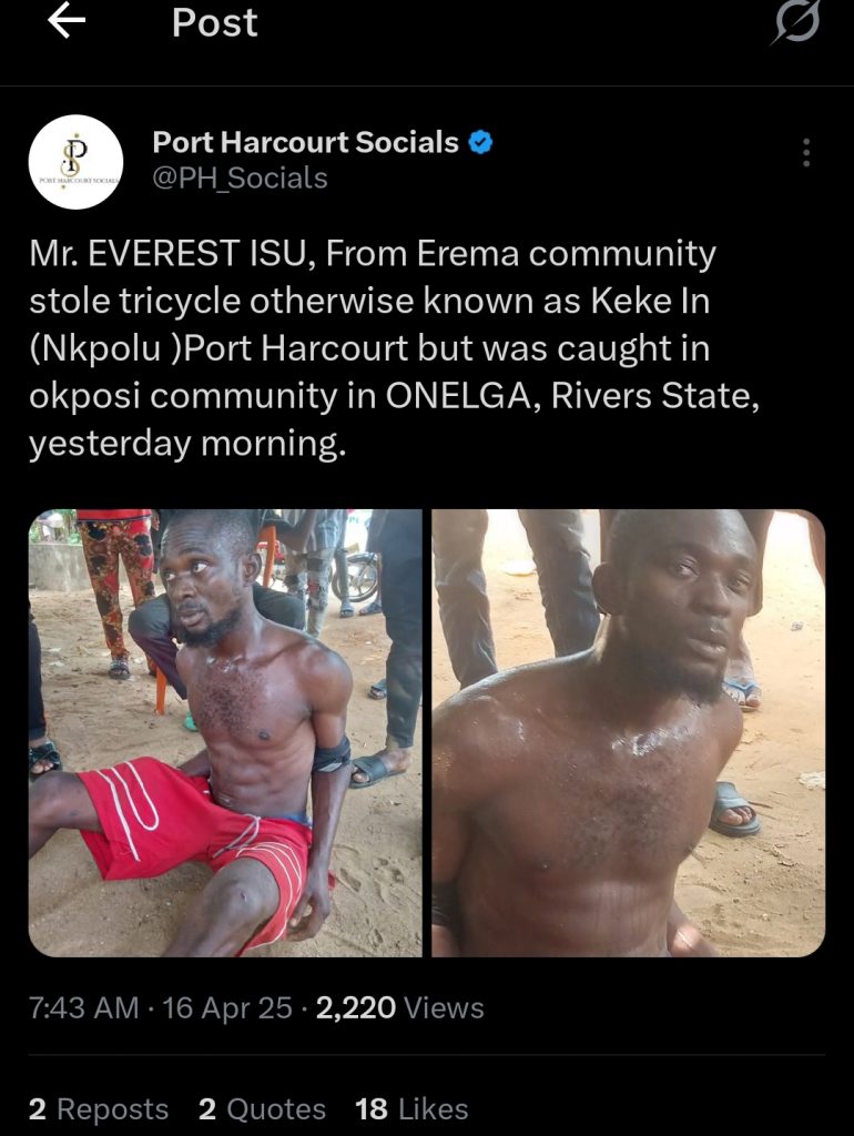 A Nigerian man who allegedly stole a tricycle in the Erema community of Rivers State, Port Harcourt, has been apprehended.