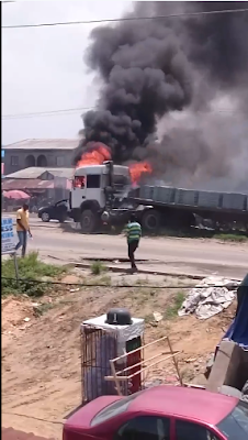Truck bursts into flames on the road at Sangotedo