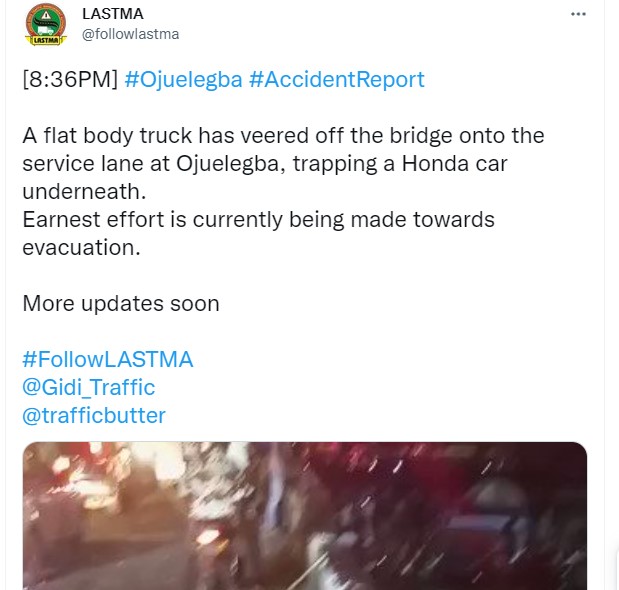 A flat body truck has veered off the bridge onto the service lane at Ojuelegba, trapping a Honda car underneath.Earnest effort is currently being made towards evacuation.
