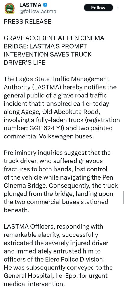 According to the Lagos State Traffic Management Authority (LASTMA), the truck driver sustained severe fractures to both hands. He was rescued by LASTMA officials and handed over to Elere Police officers before being taken to General Hospital, Ile-Epo, for urgent treatment.
