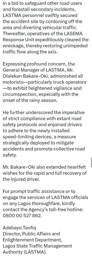 Expressing concern over the incident, LASTMA General Manager, Mr. Olalekan Bakare-Oki, urged motorists, especially truck drivers, to exercise extra caution during the rainy season. He emphasized the importance of adhering to road safety rules and complying with newly installed speed-limiting devices to prevent future accidents.