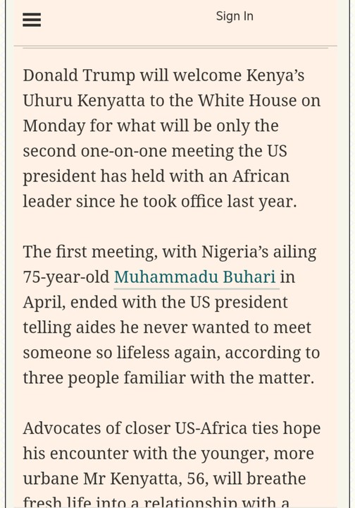 “Trump likes chemistry,” said a person in touch both with senior US administration officials and the Kenya delegation preparing for Monday’s meeting. “Africa has never been high on his radar but if the big guy likes you he’ll find a way to make things work.”