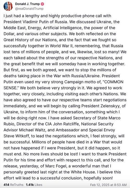 “We have also agreed to have our respective teams start negotiations immediately, and we will begin by calling President Zelenskiy, of Ukraine, to inform him of the conversation, something which I will be doing right now,” Trump said in a post on his social media platform.