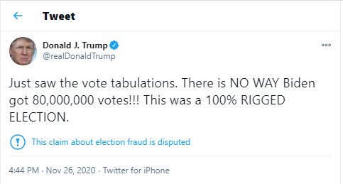 “Just saw the vote tabulations. There is NO WAY Biden got 80,000,000 votes!!! This was a 100% RIGGED ELECTION.”